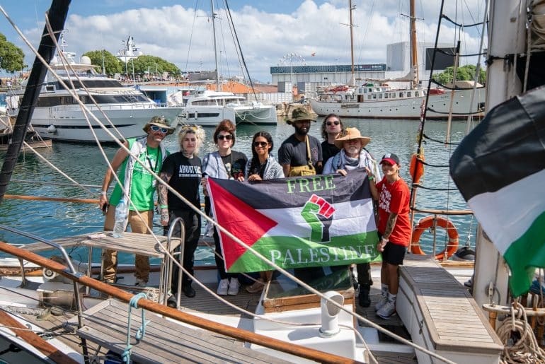 Zue Jernstedt: Bé, és curiós que diguis «va dur». Em va trucar la meva amiga, la meva amiga palestino-estatunidenca, Dina, amb la qual vaig estar a Cisjordània l’any passat. Havíem estat fent presència protectora plegades. Em va trucar i em va preguntar si coneixia algú que tingués un vaixell. Li vaig dir: «No, no tinc diners per a vaixells. Els vaixells són cars, no formo part de cap club nàutic ni res per l’estil».