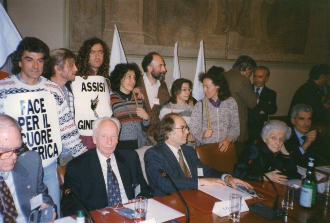 Ils m’ont tous convaincu d’accepter la proposition d’Adolfo : changer l’itinéraire de mon nouveau « pèlerinage » pour la paix, repartir vers le nord, vers Genève, cette fois depuis Assise, en suscitant en Italie la même solidarité que celle que nous avions suscitée au début de cette même année dans les villes de Catalogne et de France (grâce en grande partie aux réseaux internationaux d’Amnesty International). Mais le hic, c’était que Adolfo nous promettait d’obtenir le soutien de la dizaine de lauréats du prix Nobel qui se réuniraient à Milan le 6 décembre 1996. Ils nous y recevraient effectivement à la date fixée. Mais ce jour-là, tout ne s’est pas passé à merveille.